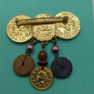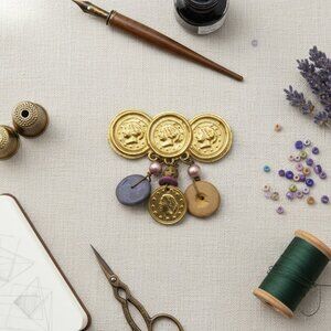 Elevate your ensemble with this captivating "Triumvirate" medallion brooch, a piece that whispers of ancient treasures and artistic sensibility. This striking brooch features three exquisitely detailed medallions, each crafted with an antiqued gold finish that evokes the allure of time-honored relics.