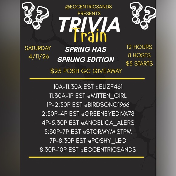 $5 Starts! Each host will ask 8 trivia questions. Subject is at the discretion of the host. Timing of questions is also at the discretion of the host. No purchase necessary to play trivia. At the end of the train, the person that has answered the most trivia questions correctly will win a $25 POSHMARK gift card! This will be announced during the last 10 minutes of the last show. Woohoo!!!! Come on now! Who doesn’t love a gift card?!?!