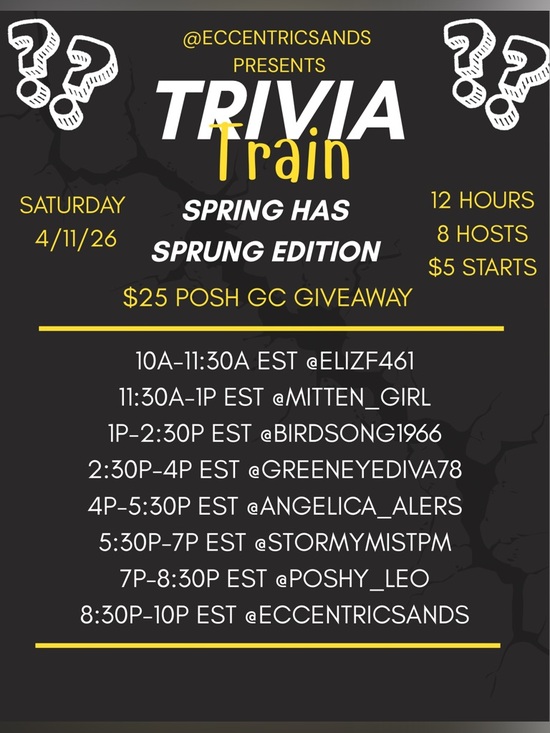 Join the Trivia Train for a chance to win a $25 Posh GC. 12 hours, 8 hosts. Starts at 10 AM EST.