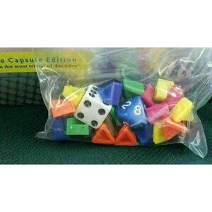 Includes: Instructions, Game Board, Cards in Box, 5 Card Holders, 1 Six Sided Die, 1 Ten Sided Die, 4 Decorated Pawns, and 24 Scoring Wedges.
