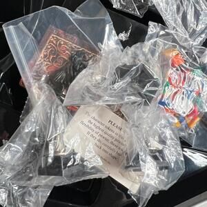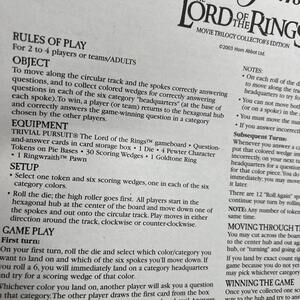 Rare Trivial Pursuit: The Lord of the Rings Movie Trilogy Collector’s Edition board game by Hasbro (2003). Includes gameboard, 300 question-and-answer cards, die, 4 pewter character pawns (Frodo, Galadriel, Gandalf, Aragorn), 1 goldtone One Ring replica, 1 Ringwraith pawn, and 30 scoring wedges. Designed for 2–4 players or teams. Box shows minor shelf wear, contents in very good condition with pieces still bagged. A must-have collectible for LOTR fans and board game enthusiasts.
