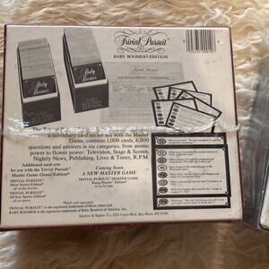 Trivial Pursuit subsidiary card decks: Silver Screen & Baby Boomer editions. 2 sets each with 1000 cards in each box. Does not come with the master game, just additional card packs. Vintage.