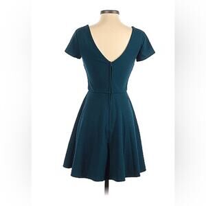 Soft textured fabric in a jewel tone teal. Vee in front has what feel like corset stays to keep it straight, and there is a back zipper. No pockets, lots of stretch.
