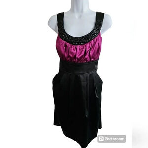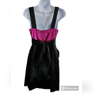Trixxi black and deep purple sleeveless cocktail dress in size 9. Features a rich satin-like texture with a gathered magenta bust, rhinestone-embellished neckline, and a wide black waistband for a flattering silhouette. Includes side pockets, a self-tie sash at the back, and a hidden back zipper. Perfect for formal occasions, homecoming, date nights, or Y2K-inspired events.