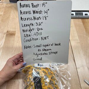 • Across bust = 15", waist = 14", hips = 18", length = 32"