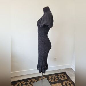 Cute and flattering fully smocked midi dress with a Ruffle hemline and puffed sleeves. All black. Bodycon fit. Excellent condition. Size small measures approximately 41 inches long 14 inches underarm to underarm laid flat.