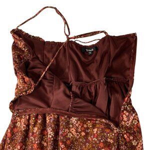 This Trixxi women's Dress makes a statement due to it's junior's sizing, sleeveless fit & flare silhouette, adjustable spaghetti straps, sweetheart neckline, corset lace up back, side zipper, ruffle trim, midi hem, lining and brown floral design.