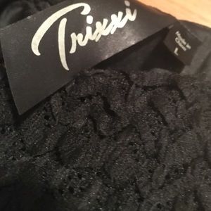 This is a large Trixxi maxi dress with spaghetti straps. It has a keyhole cutout and a bow design in the back. The bottom half is a sheer pattern, but it has an underskirt attached.