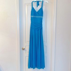 Junior Medium Teal prom dress Lined Rhinestones Ties behind neck Padded bra A few of the pictures look blue, but it’s definitely teal. Please look at the close-up pictures to see the true color!