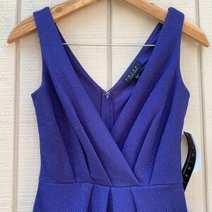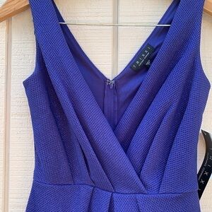 Beautiful royal blue pleated cross chest cocktail dress. Tonal flecks of glitter throughout for just the right amount of sparkle! Fully lined. Back zip with hook and eye closure.