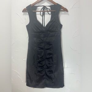 This black satin dresss is a head turner and hugs you in all the right places. Ruched design, string tie closure in the back. Pleated bodice and wide shoulder straps. Long hidden zipper at the back