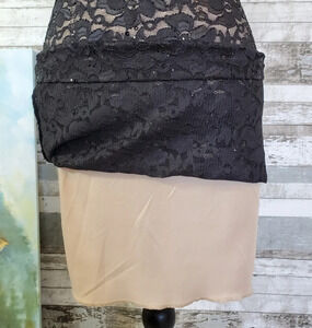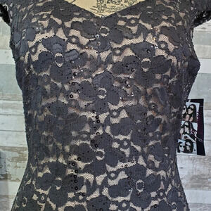 Elegant and flirty at the same time. Black lace with sequins that catch the light to add some quiet sparkle. Knit beige liner.