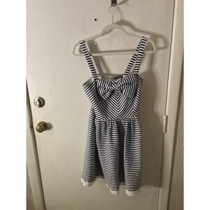 Style : Navy Blue & White Striped Dress with. Eyelet White lace at bottom hem Bow at top front hem Inside top of dress lined in white for comfort and privacy. Zip back