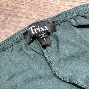 Super cute and casual. Breezy cotton, button up mini-dress in forest green with puff-sleeves and tiered, ruffly skirt – fit and flare style. Great for summer! Size L