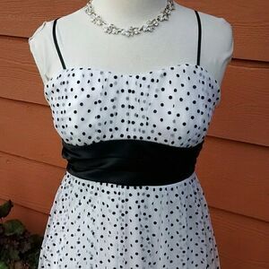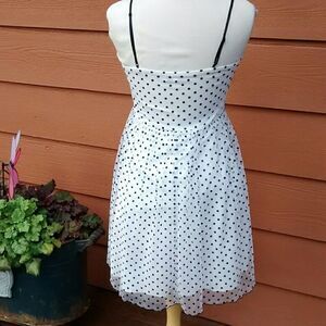 Darling dress. Black dots on white. Black satin ruched at waist in front. Elastic, adjustable straps, built in bra. Fully lined, additional petticoat to add volume. Says L, but this is closer to a 4-6. 31 at chest, 30 at waist full skirt, 34 long from shoulder to hem, 27 long from under arm to hem. Sweet as it can be.