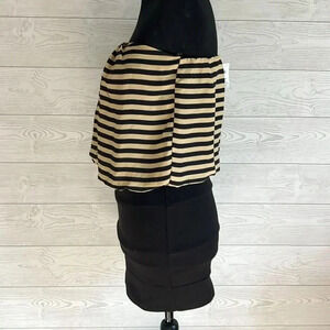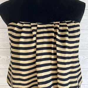 Strapless mini dress. Blouson black and tan striped top over fitted black skirt. Top is fully lined, pleated gathers in front.