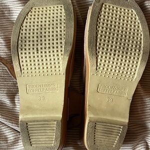 Troentorps clog sandals with buckle fastener, I believe in the natural leather color. they have a bit of a heel to them and make the nice wood clog sound when you walk! They’re an EU 39 which is about a US women’s size 8.5-9 :)