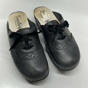 Swedish clog model with brogue style stitching in dark gray and black leather. Stapled onto a comfy bottom. "Fanny " combines the comfort of classic Swedish clogs with a stylish stitched front and silky black laces. $128 retail. Sold out color combo.