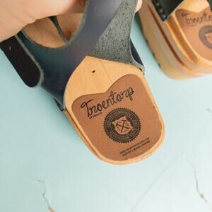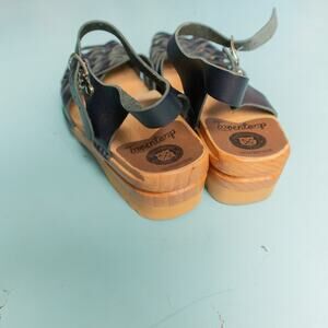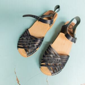 Features: Black leather upper with wood base and rubber tread buckle ankle swedish clogs.