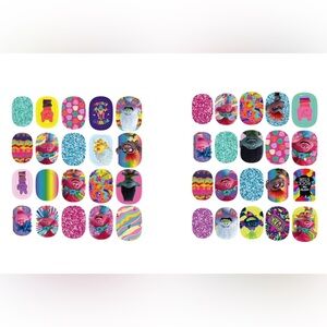 Fun Trolls-themed press-on nails. Includes colorful designs. Perfect for dress-up and play.