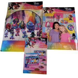 Trolls World Tour party decoration bundle featuring a colorful backdrop kit, table centerpieces, and themed favor boxes. Perfect for birthdays and Trolls-themed celebrations. Includes banners, cutouts, and vibrant designs with favorite Trolls characters. Packaged and shipped carefully from a smoke-free environment. Check my Feedback and other listings.