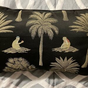 Elegant black pillow featuring intricate palm tree and monkey embroidery. Adds a tropical flair to your decor.