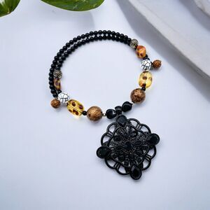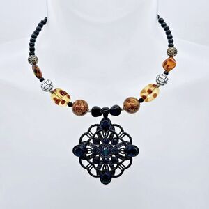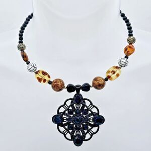 Tropical Boho Necklace Choker Lia Sophia Pendant Jeweled Medallion Adjustable. Necklace is beaded wire choker open/adjustable. Pendant is Lia Sophia 2 1/2" x 2 3/4". In great pre-owned condition.