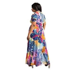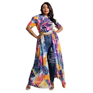 Designed to flow with every step, this statement piece features bold tropical prints and a lightweight feel that’s perfect for layering. The short sleeves and breezy silhouette keep it cool, while the high slit adds a striking touch.