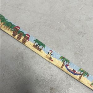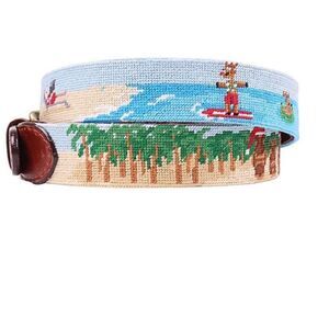 Colorful needlepoint belt with beach scene. Features palm trees, sand, and ocean motifs.
