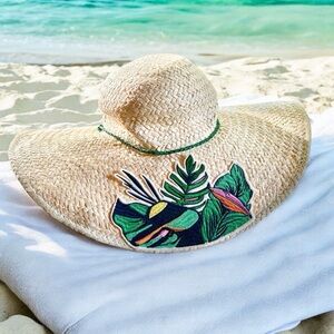 Chic summer floppy woven sun hat and matching bag set with vibrant tropical floral and palm embroidery in bright colors. 🌺 🌴 🌸 ☀️