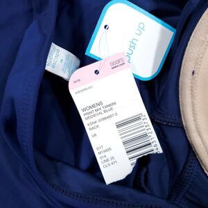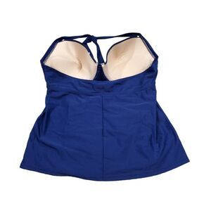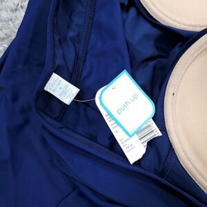 Women's Tropical Escape Halter tankini swim top with underwire and push up padded cups. Retro style polka dot print in navy blue and white. New with tags, has small snags on one of the cups as shown in photo. Women's size 14.