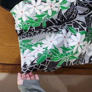 excellent like new condition one size fits most green black white floral kaftan by tropical eve Hawaii