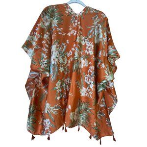 This lightweight kimono-style cover-up features a vibrant tropical floral print on a terracotta orange background. The flowing silhouette is enhanced with decorative tassels along the hem, offering versatile styling options for beach or casual wear.