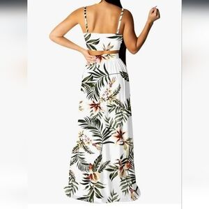 Stunning 2 piece tropical floral maxi dress. Features vibrant green and pink floral patterns on a white base. Halter top with flowing maxi skirt. Perfect for summer outings.Please note: skirt is slightly sheer and has built-in underwear (underwear isnt sheer). Gorgeous! New and in excellent condition!