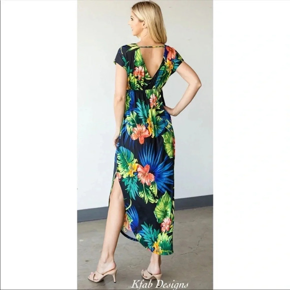 πΊ Say hello to vacation vibes! This Tropical Floral Maxi Dress is the ultimate go-to for sunny days, tropical getaways, and beachside dinners. Featuring a v-neckline with open back detail, flowy silhouette, and bold floral print, itβs both flattering and effortlessly chic.