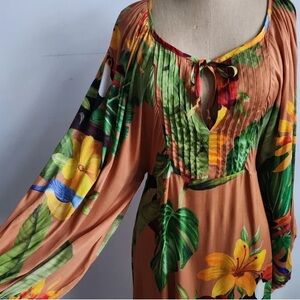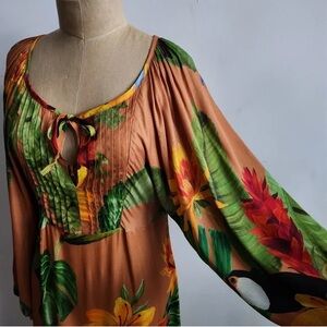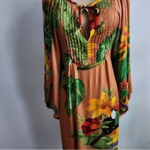 Stunning tropical floral maxi dress with long sleeves. Features vibrant orange, green, and yellow hues.