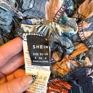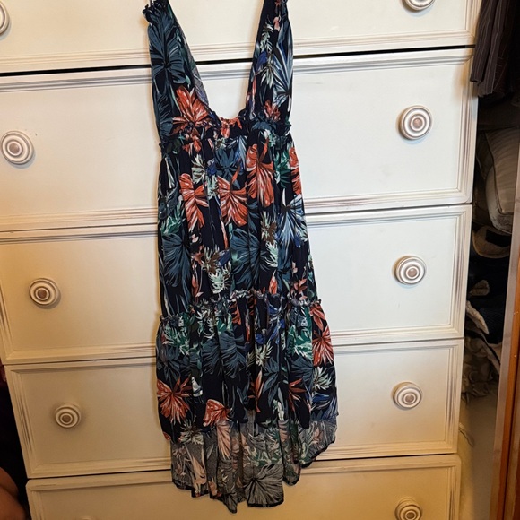 Vibrant tropical floral print dress with a mix of colors. Perfect for summer outings. Has an open back with a deep V cut in the front.