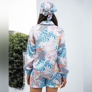 Vintage floral print long sleeve, button front, button cuff, elastic waist with matching hair scarf make this your retro boho go to! fabric is super soft and luxurious