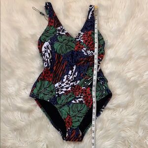 Features: beautiful floral print bathing suit with a scrunch side detail. Adjustable straps. Built in cups. Vneck style. Colors red green cream white and brown. Super fun and classy!