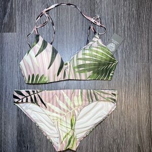 Embrace the summer vibes with this stylish tropical green leaf print bikini. Perfect for beach days and poolside lounging.