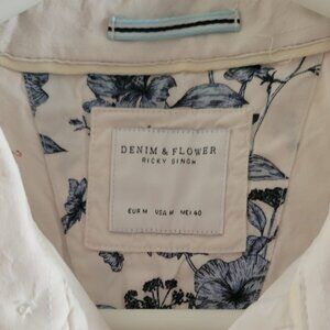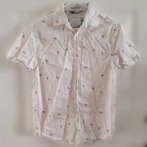 Stylish and summery tropical holiday-style shirt. Flamingo, pineapple, palm tree print. Worn once, was in storage, otherwise like new! 60% cotton, 38% viscose, 2% spandex. Inside tag says M, fits more like an S