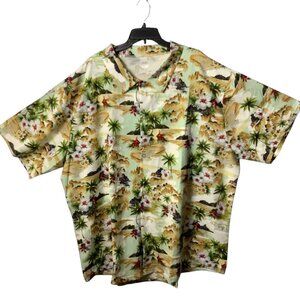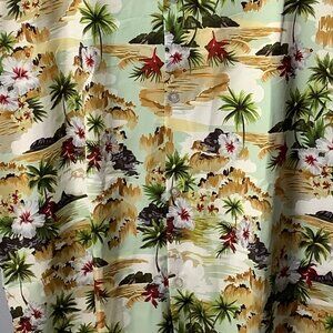 A refined Hawaiian shirt that bridges casual comfort with sophisticated design. The intricate landscape print captures the essence of island scenery, featuring palm trees, rocky coastlines, and hibiscus flowers in a muted color palette. Ideal for professionals seeking a touch of relaxed elegance in warm-weather attire.