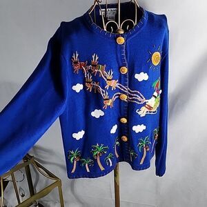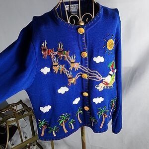 Ugly Christmas Sweater Winter Cozy Tropics Tropical Santa Claus Rudolph Reindeer Beads Sequins Embroidery Heirloom Cardigan Sweater