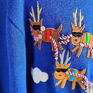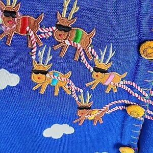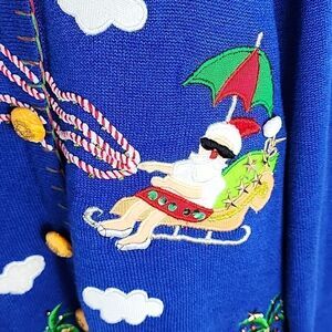 Puffs white embroidered and textured clouds in a royal Blue sky, with Tropical Santa in his shades, cruising around with 5 of his reindeer! Of course Rudolph is pulling the Sleigh with nothing less than a tropical sequin "lei"! Super cute sequined, beaded, textured, embroidered, decoratively stitched, Fun Sweater! On the lower portion of the Sweater are palm trees with pom pom coconuts, stars and colorful beads on embroidered trunks. Just so much to look at! The crew neckline has red and green stitching around it, as well as down center and around lower hem.