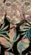 Vibrant dress with a tropical leaf pattern. Features shades of black, pink, blue, and green.