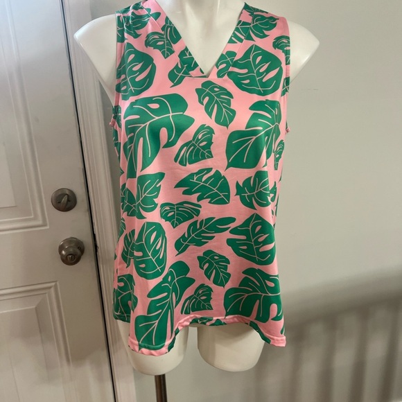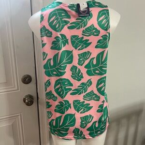 Embrace a vibrant look with this tropical leaf print top. Featuring a lively pink and green design, this top is perfect for adding a splash of color to your wardrobe. Looks like Top It Off brand