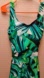 Stylish romper style swimsuit with a vibrant tropical leaf print. Features shades of green and white. very pretty . pre-owned... slit front skirted swim