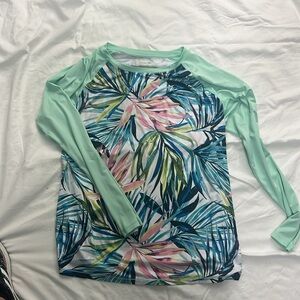 Vibrant tropical print rash guard with long sleeves. Features shades of blue, green, and pink.