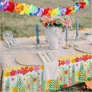 Elevate your next Tropical Luau Party with our comprehensive package, including 25 pcs of 9 inch dinner plates and 7 inch dessert plates, each adorned with vibrant hibiscus designs,any Hawaiian party decorations. Also included are 25 pcs of 9 oz paper cups, 25 pcs of luxurious 3ply luncheon napkins, a 54x108 inch disposable plastic tablecloth, and a festive banner, ensuring you have all the essentials for your tropical celebration.