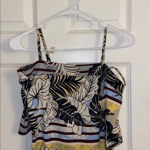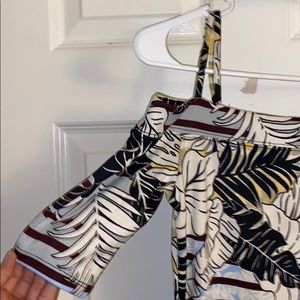 Double string. Short sleeve. Off the shoulder. Bodycon fit. Tropical leaves print.